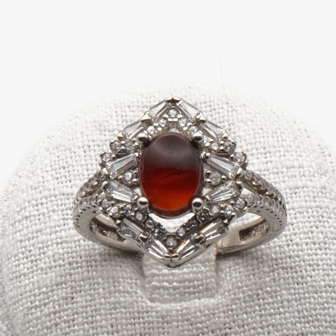Ein ausdrucksstarker Damenring aus hochwertigem 925 Sterling Silber, besetzt mit einem echten Jemen-Achat in tiefem Dunkelrot. Der glatt polierte Edelstein zeigt die charakteristische, natürliche Farbwirkung des Achats und wird von einer aufwendig gestalteten Silberfassung mit funkelnden Akzenten harmonisch eingerahmt.