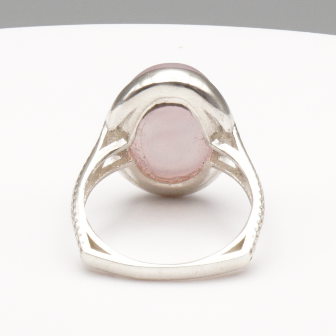 Der große, oval geschliffene Cabochon zeigt eine zarte roséfarbene bis milchig transparente Farbgebung mit sanftem innerem Schimmer. Besonders charakteristisch ist die kunstvolle Gravur „Ali“ im Stein, die diesem Schmuckstück eine individuelle und kulturell inspirierte Note verleiht.