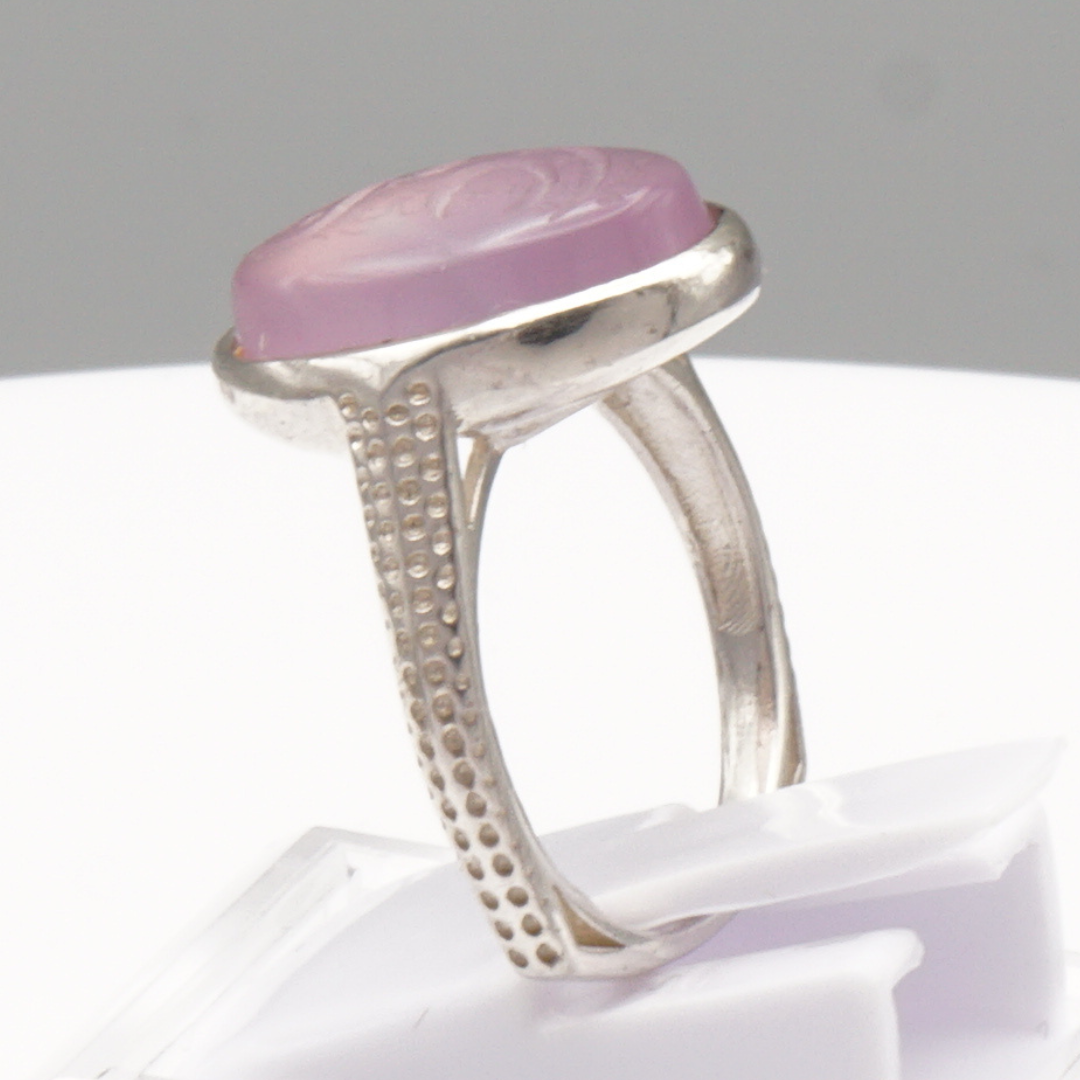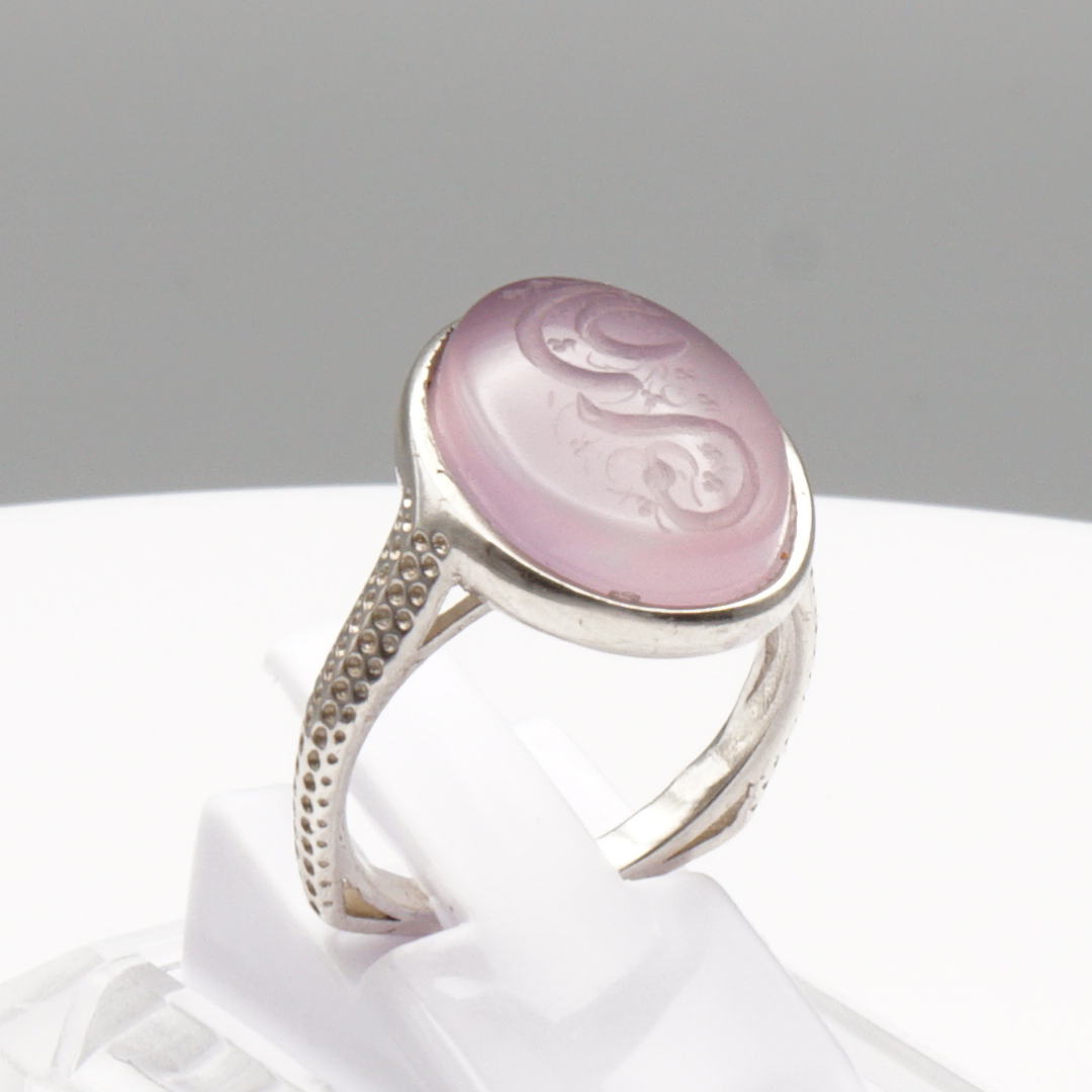 Der große, oval geschliffene Cabochon zeigt eine zarte rosé-milchige Transparenz mit ruhigem innerem Schimmer. Besonders hervorzuheben ist die feine Gravur „Ali“, die dem Stein eine persönliche, orientalisch inspirierte Note verleiht und dieses Schmuckstück zu etwas ganz Besonderem macht.