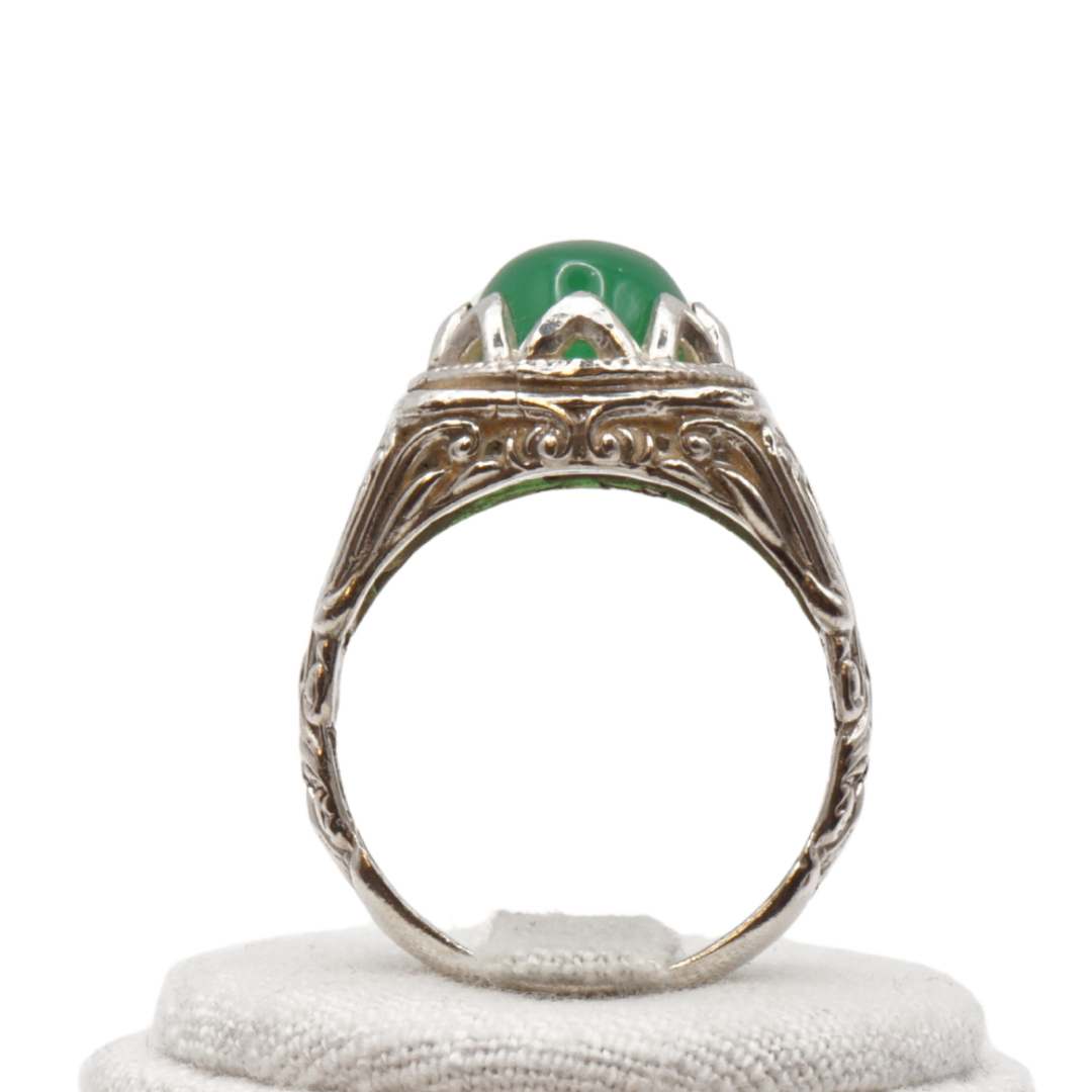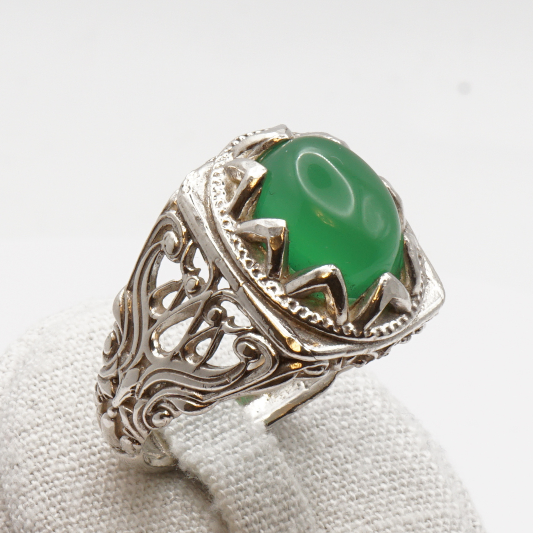 Ein klassischer Herrenring aus echtem 925er Sterling Silber mit kunstvoll verziertem Design. Im Zentrum steht ein seltener grüner Jemen-Achat, der durch seine satte, tiefgrüne Farbe besticht. Der Stein zeigt bei Lichteinfall eine feine, natürliche Transparenz, die ihn besonders edel wirken lässt.