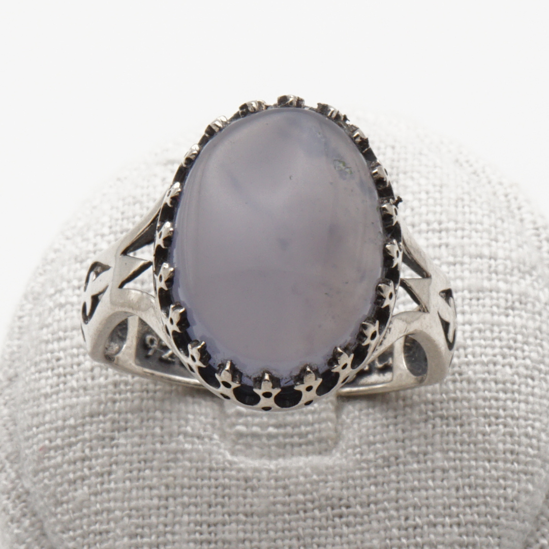 Der glatt polierte Cabochon zeigt einen kühlen grau-bläulichen Farbton mit sanften, natürlichen Strukturen. Die kunstvoll gearbeitete Silberfassung mit ornamentalen Durchbrüchen unterstreicht den traditionellen Charakter dieses Rings und verleiht ihm eine kraftvolle, zeitlose Ausstrahlung.