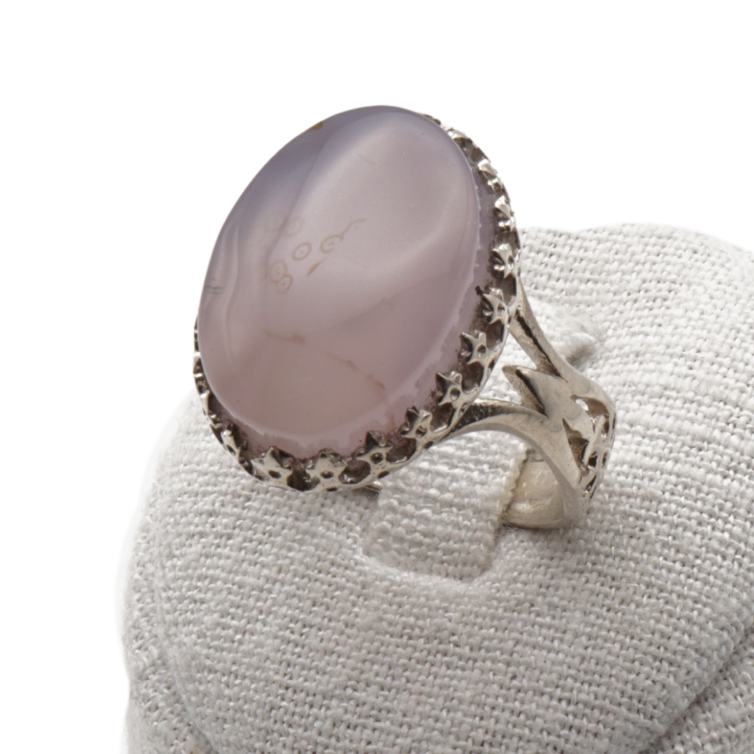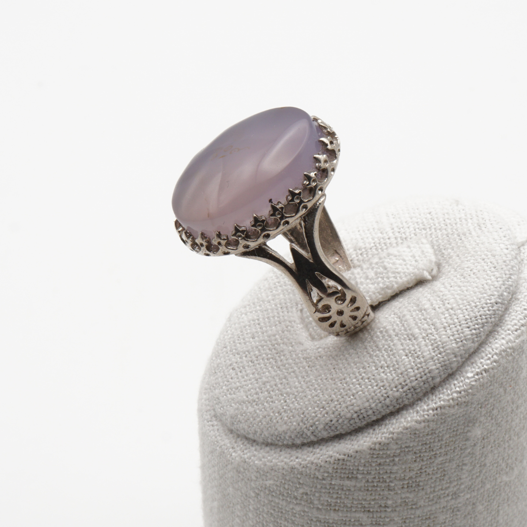 Der cabochon-geschliffene Stein zeigt eine edle blau-graue Farbgebung mit natürlichen Strukturen und feiner Zeichnung – jedes Stück ein Unikat. Die kunstvoll gearbeitete Silberfassung mit detaillierten Ornamenten an den Ringschultern unterstreicht den orientalisch-klassischen Charakter dieses Rings.