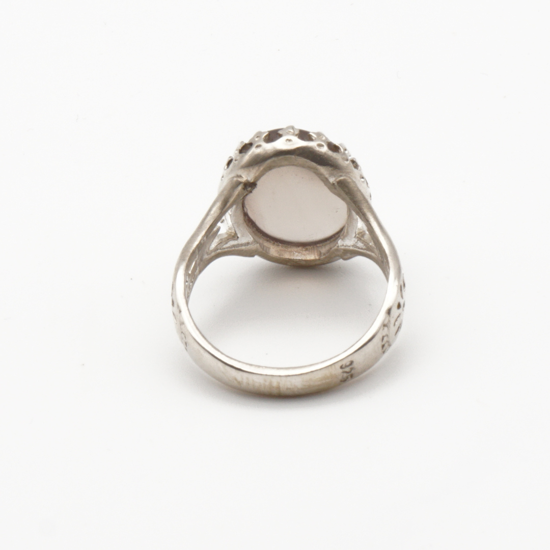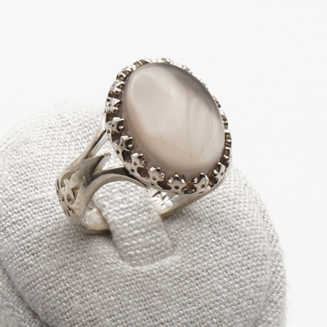 Der glatt polierte Cabochon besticht durch seine milchig-graue bis leicht transluzente Optik mit sanften Farbverläufen. Die massive Silberfassung mit fein gearbeiteten Details unterstreicht den kraftvollen Charakter dieses Rings und verleiht ihm eine zeitlose, maskuline Ausstrahlung.