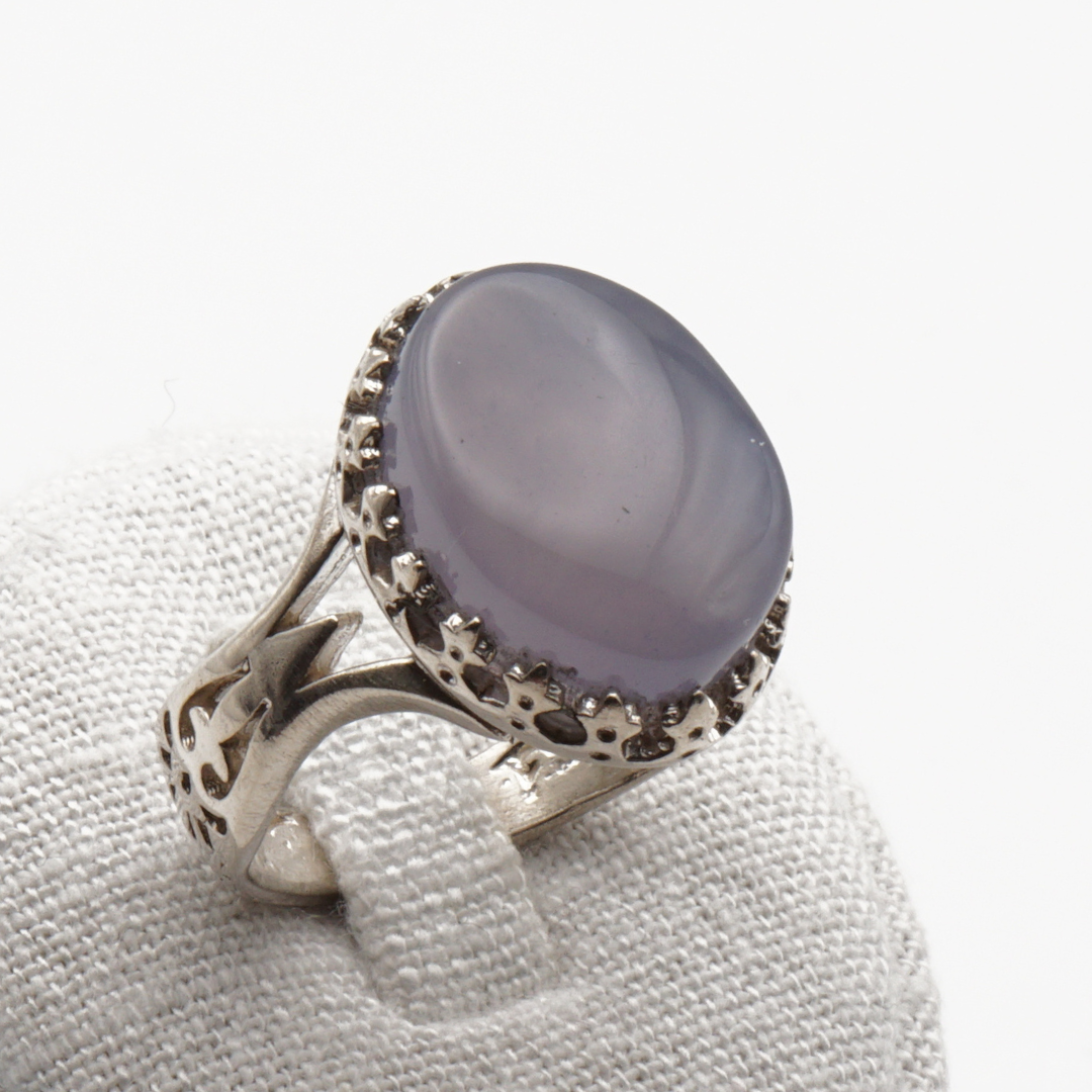 Markanter Herrenring aus 925er Sterling Silber mit einem ausdrucksstarken Jemen-Achat. Der große Cabochon besticht durch seine blau-lavendelfarbene, leicht milchige Optik mit ruhiger, edler Ausstrahlung. Die massive Ringschiene und die detaillierte Fassung unterstreichen den charakterstarken Look dieses Schmuckstücks.