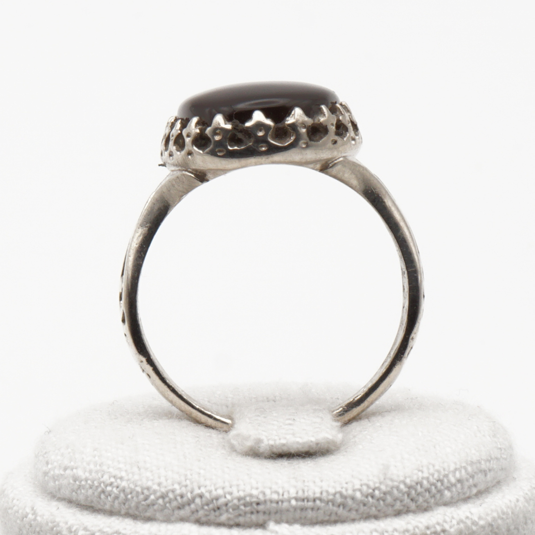 Der glatt polierte Cabochon zeigt warme Braun- und Honigtöne mit weichen natürlichen Farbverläufen. Die massive Silberfassung mit klassischen Ornamenten an den Ringschultern verleiht dem Ring eine kraftvolle und zeitlose Ausstrahlung.