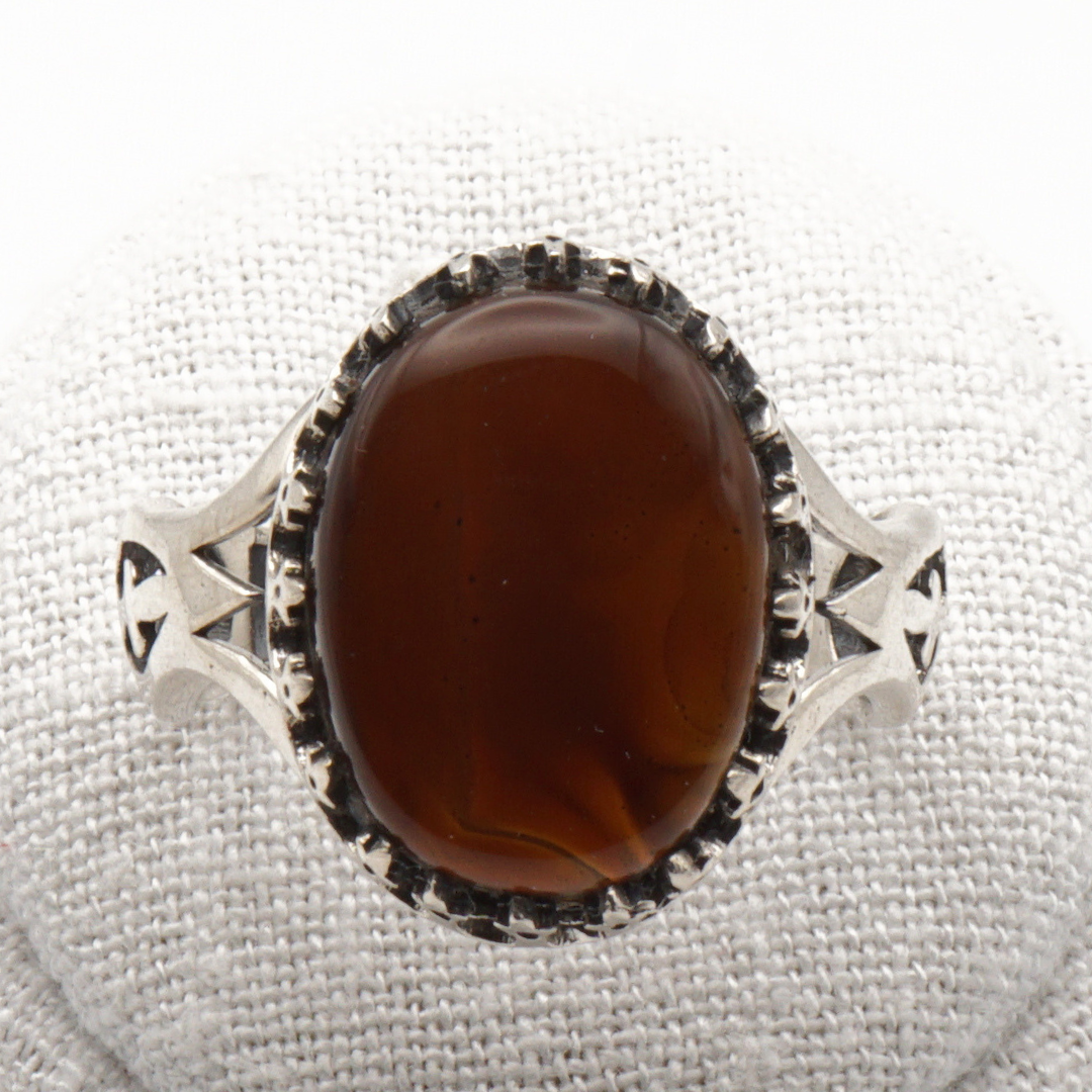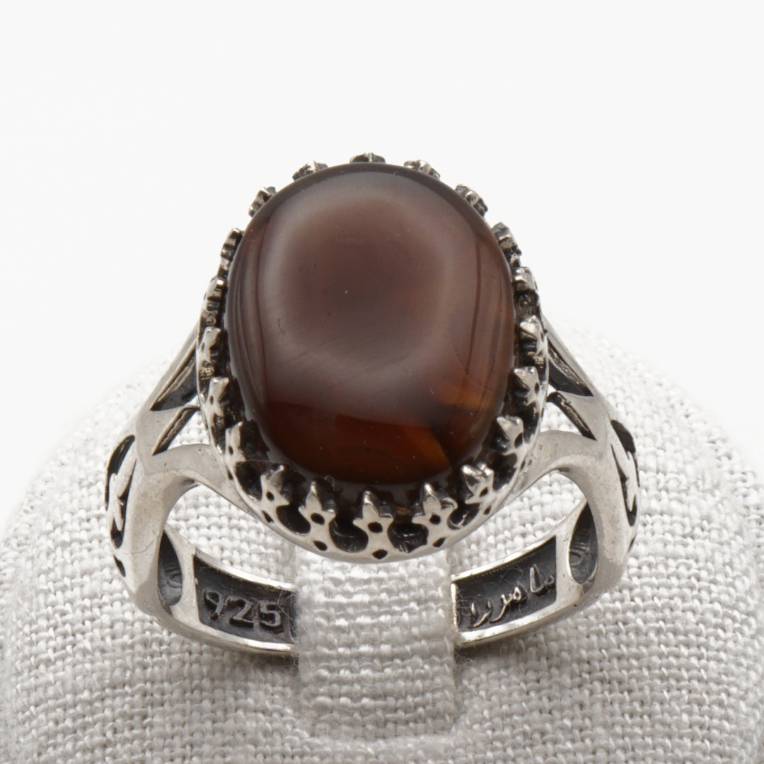 Der glatt polierte Cabochon zeigt warme Braun- und Honigtöne mit natürlichen Farbverläufen. Die massive Silberfassung mit dekorativen Details an den Ringschultern verleiht dem Ring eine kraftvolle und zugleich zeitlose Ausstrahlung.