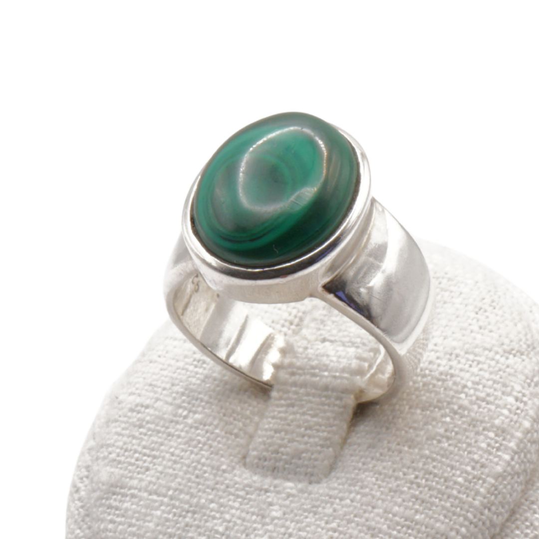 Die schlichte, massive Silberfassung unterstreicht den markanten Charakter des Rings und bringt die Tiefe des Malachits besonders schön zur Geltung. Ein authentisches Schmuckstück mit Präsenz, gefertigt aus massivem 925 Silber.