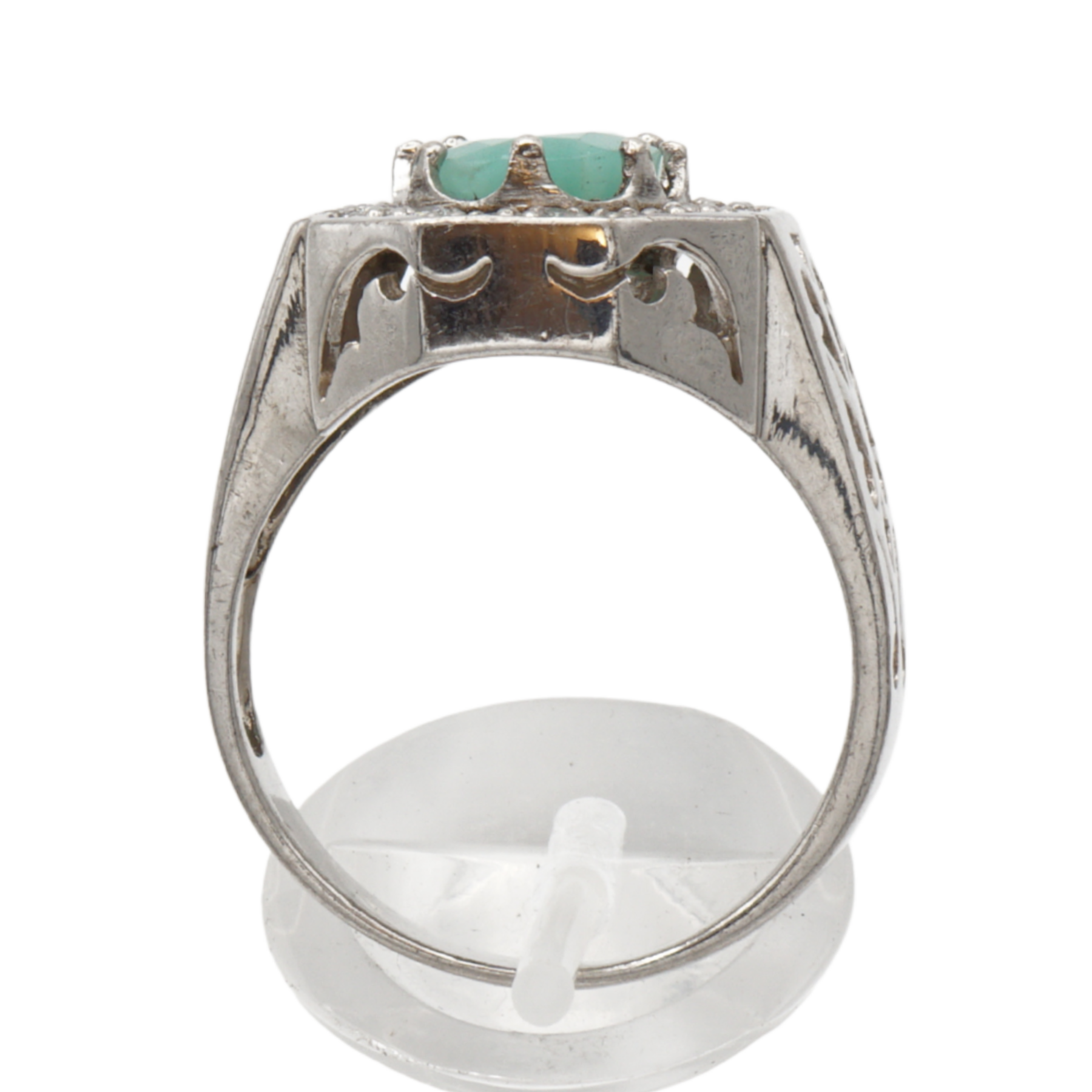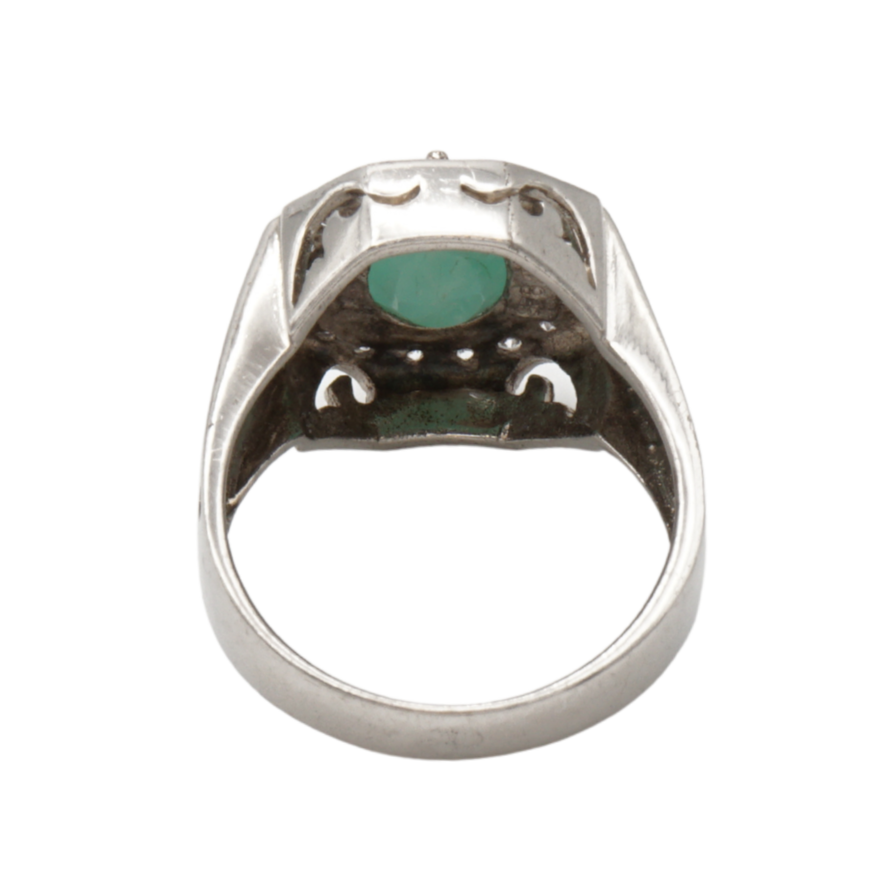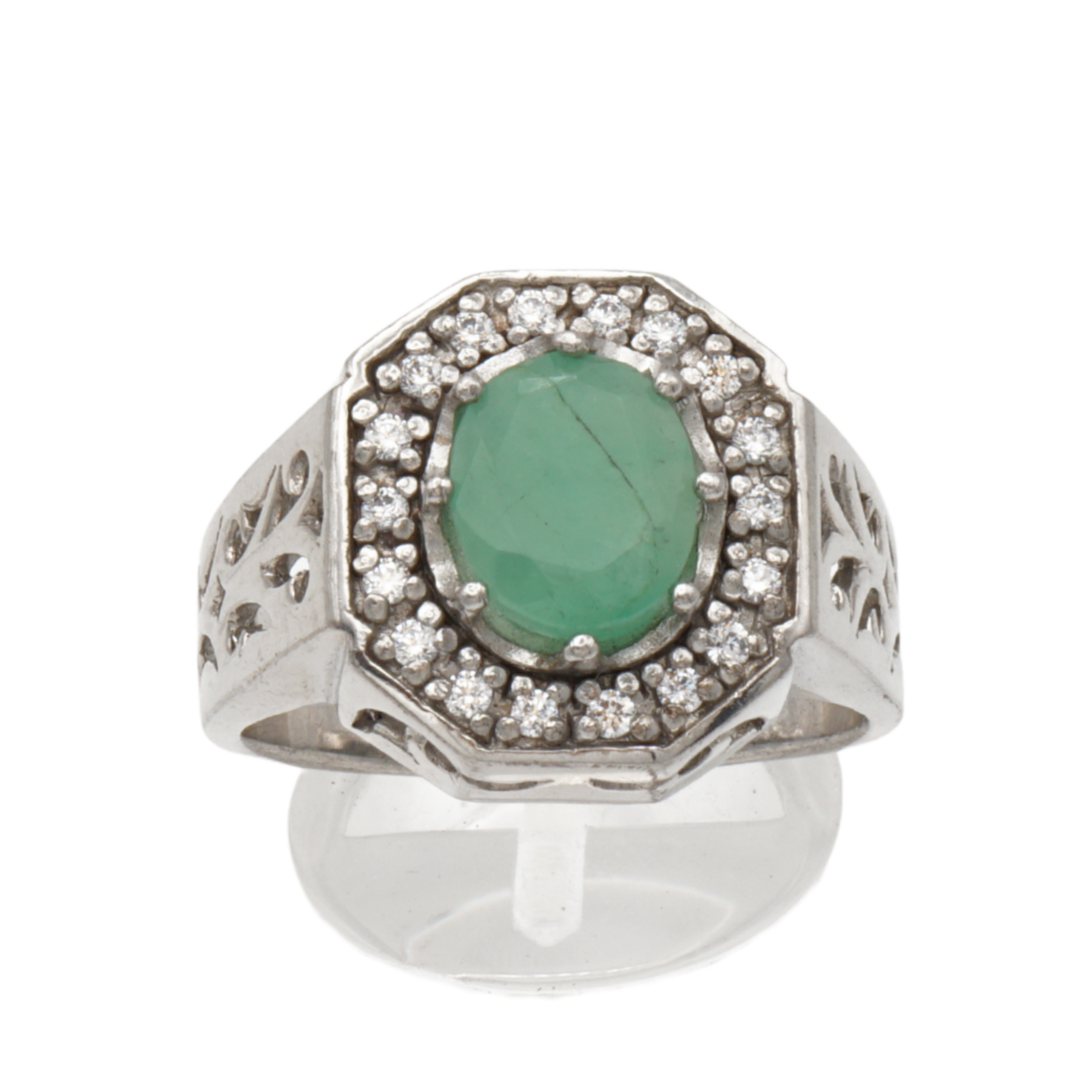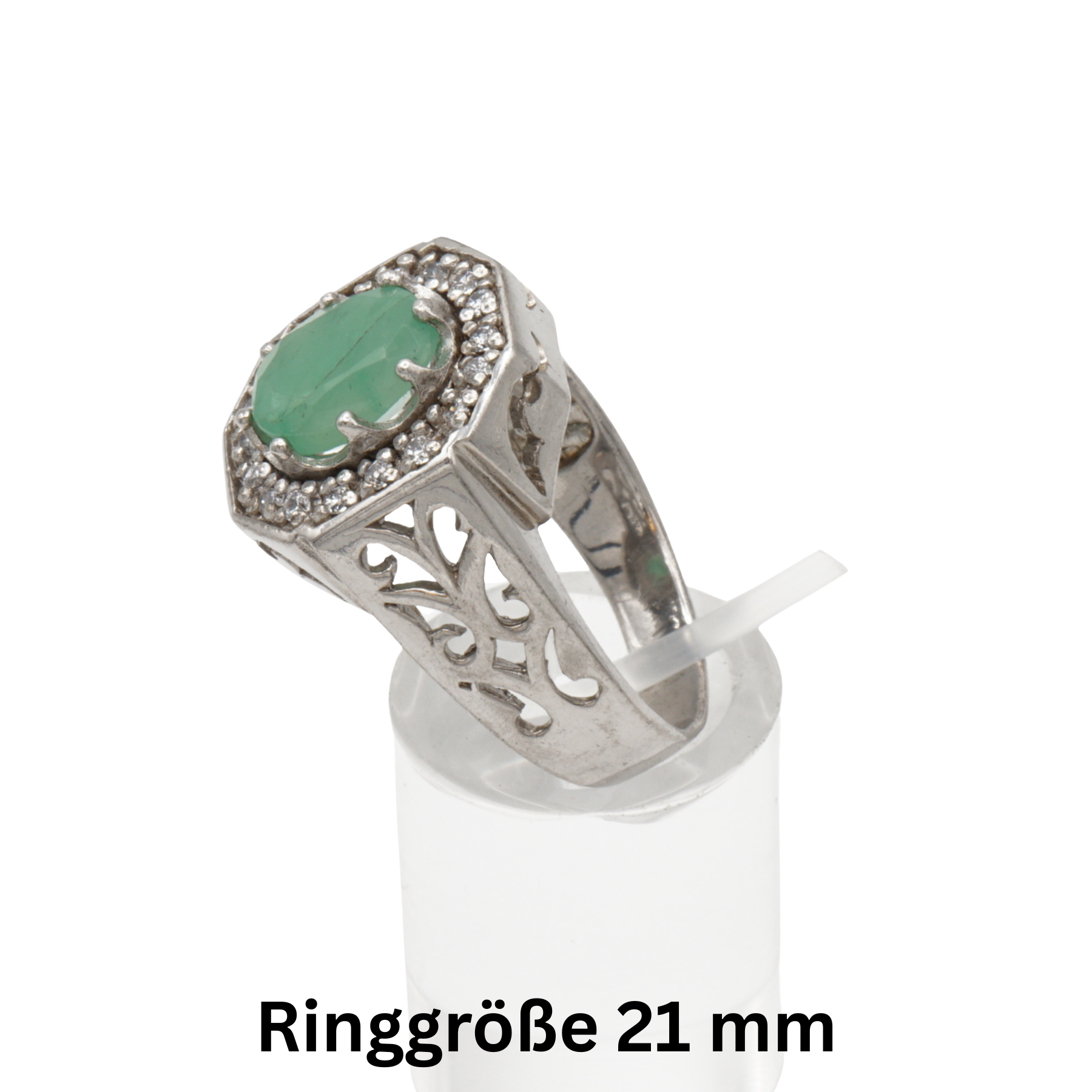 Ein eleganter Ring aus feinem 925 Sterling Silber, kunstvoll verarbeitet mit filigranen Ornamenten an der Ringschiene. Im Zentrum steht ein ovaler natürlicher Aventurin (ca. 8 x 10 mm), der von 18 funkelnden Zirkonia-Steinen umrahmt wird. Das Zusammenspiel aus Aventurin und brillantem Zirkonia verleiht diesem Ring eine besondere Strahlkraft und macht ihn zu einem echten Blickfang.