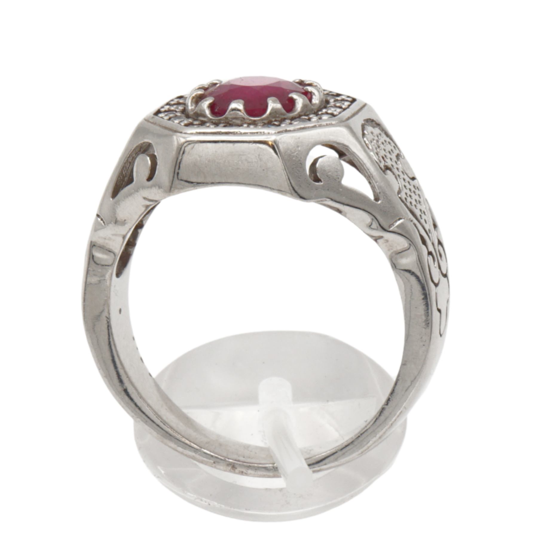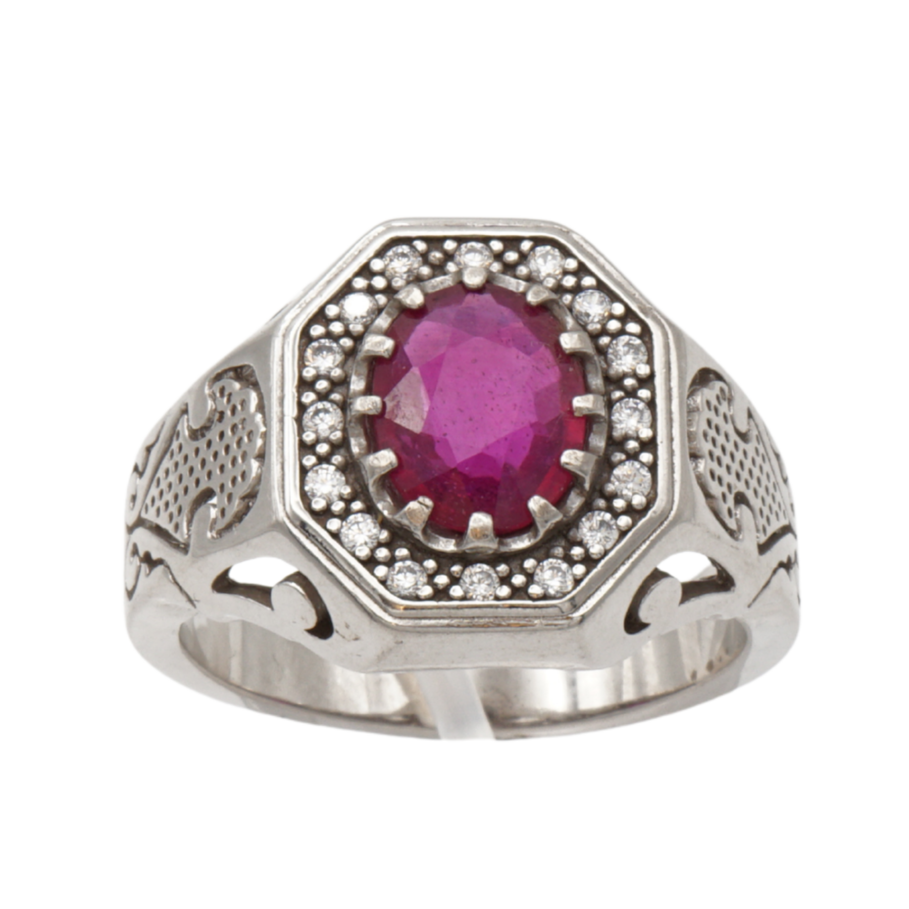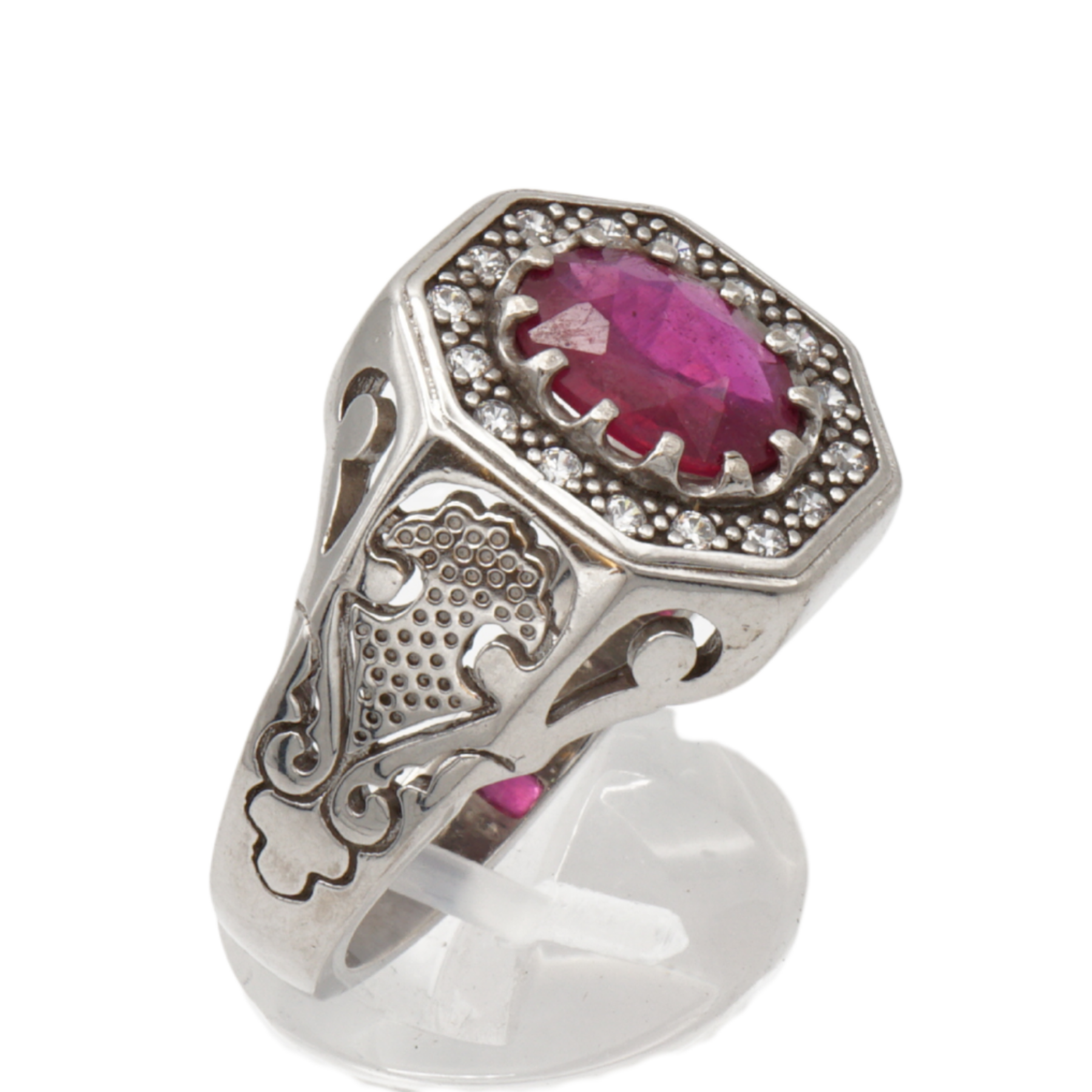 Ein eindrucksvolles Schmuckstück aus massivem 925 Sterling Silber, verziert mit einem ovalen natürlichen Rubin (ca. 8 x 10 mm). Der Rubin wurde hitzebehandelt und veredelt, um seine Farbe und Reinheit zu intensivieren – eine gängige und akzeptierte Methode in der Edelsteinverarbeitung. Umrahmt wird er von 16 funkelnden Zirkonia-Steinen, die den Ring zum Strahlen bringen. Die kunstvoll verzierte Ringschiene unterstreicht den eleganten Charakter dieses besonderen Schmuckstücks.