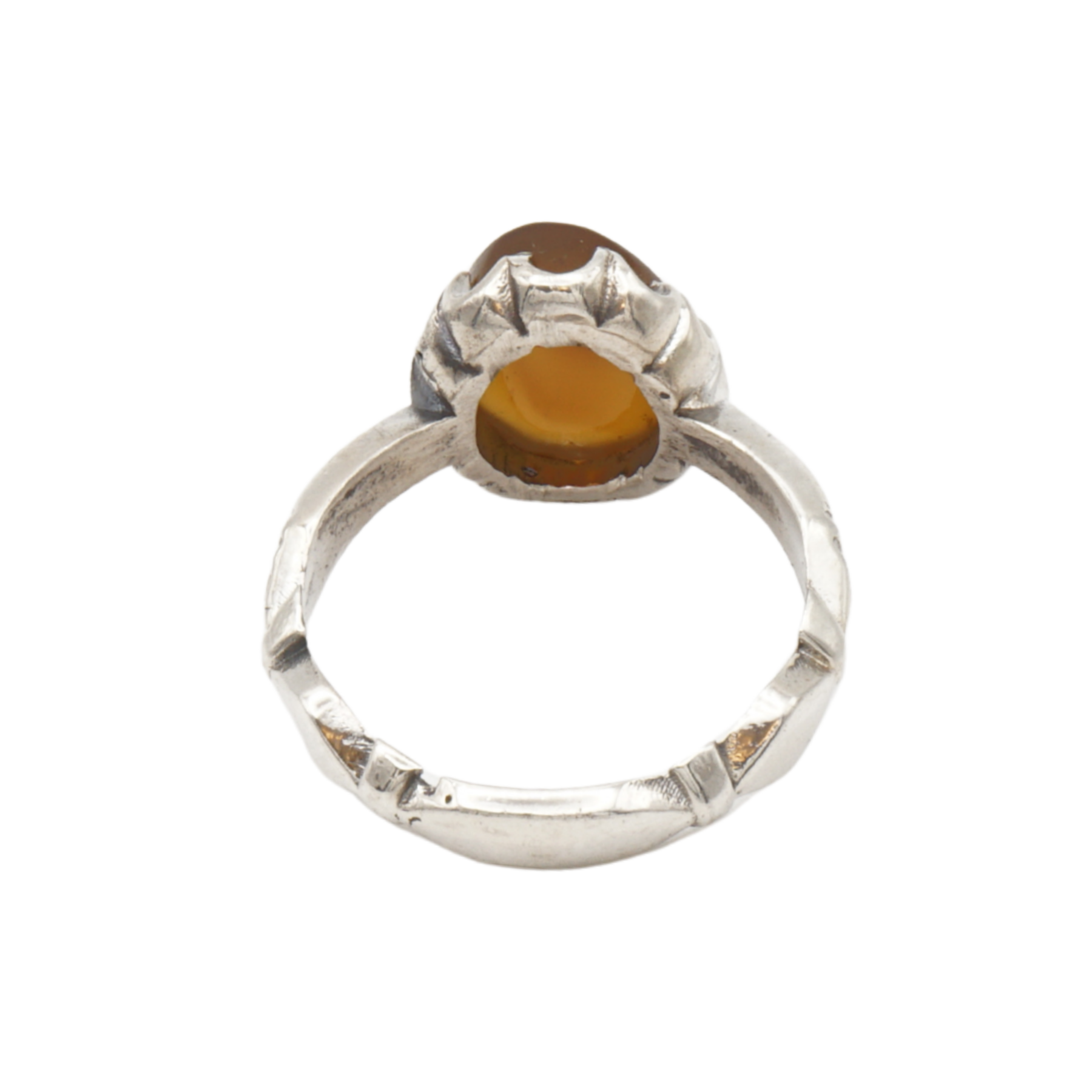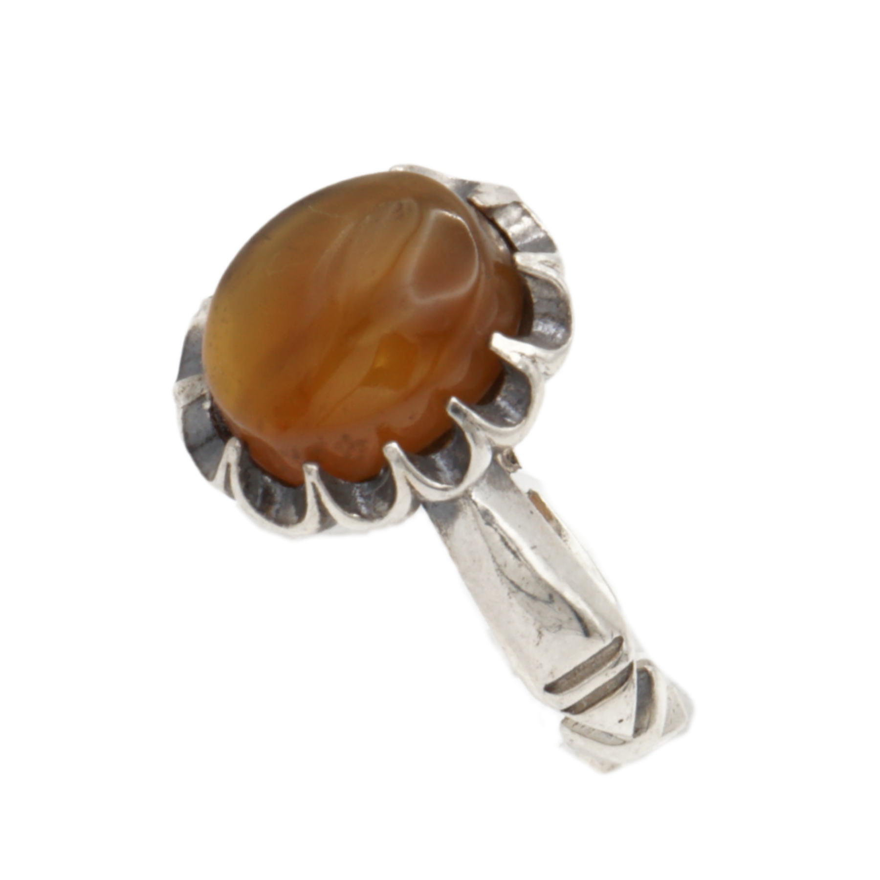 Ein einzigartiger Ring aus massivem 925 Sterling Silber, gefertigt in kunstvoller Handarbeit. Der Mittelpunkt dieses Schmuckstücks ist ein natürlicher Jemen-Achat (ca. 12 x 10 mm) mit warmem, braun-orangefarbenem Schimmer. Durch die handgearbeitete Fassung erhält der Ring eine individuelle Note und macht ihn zu einem echten Unikat.