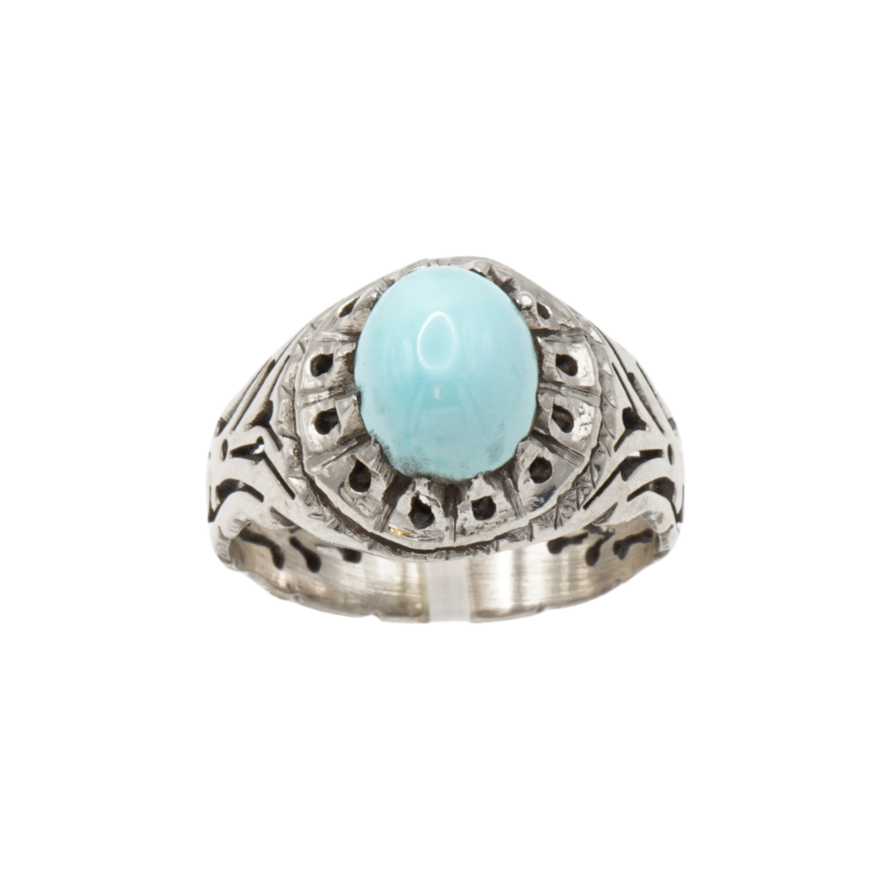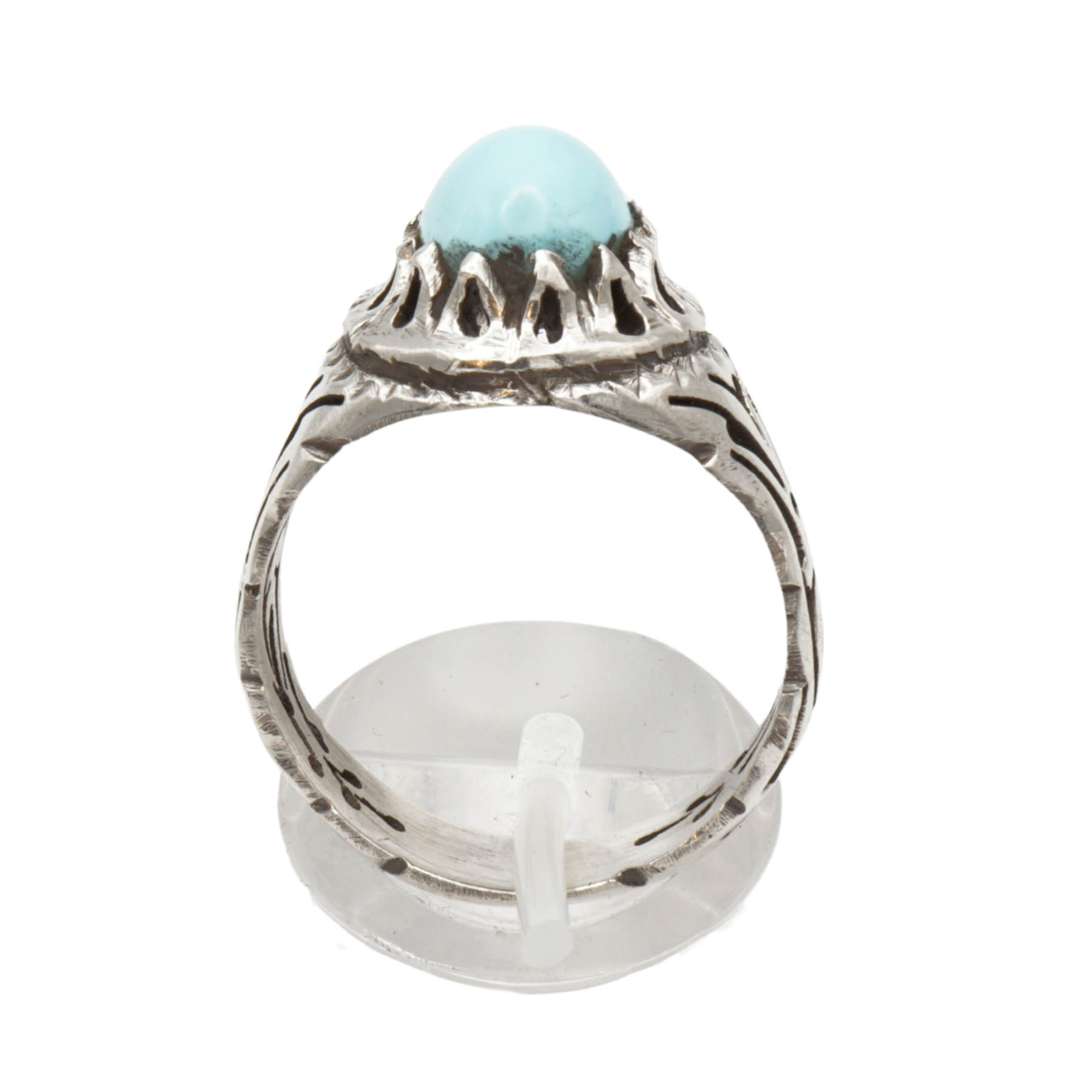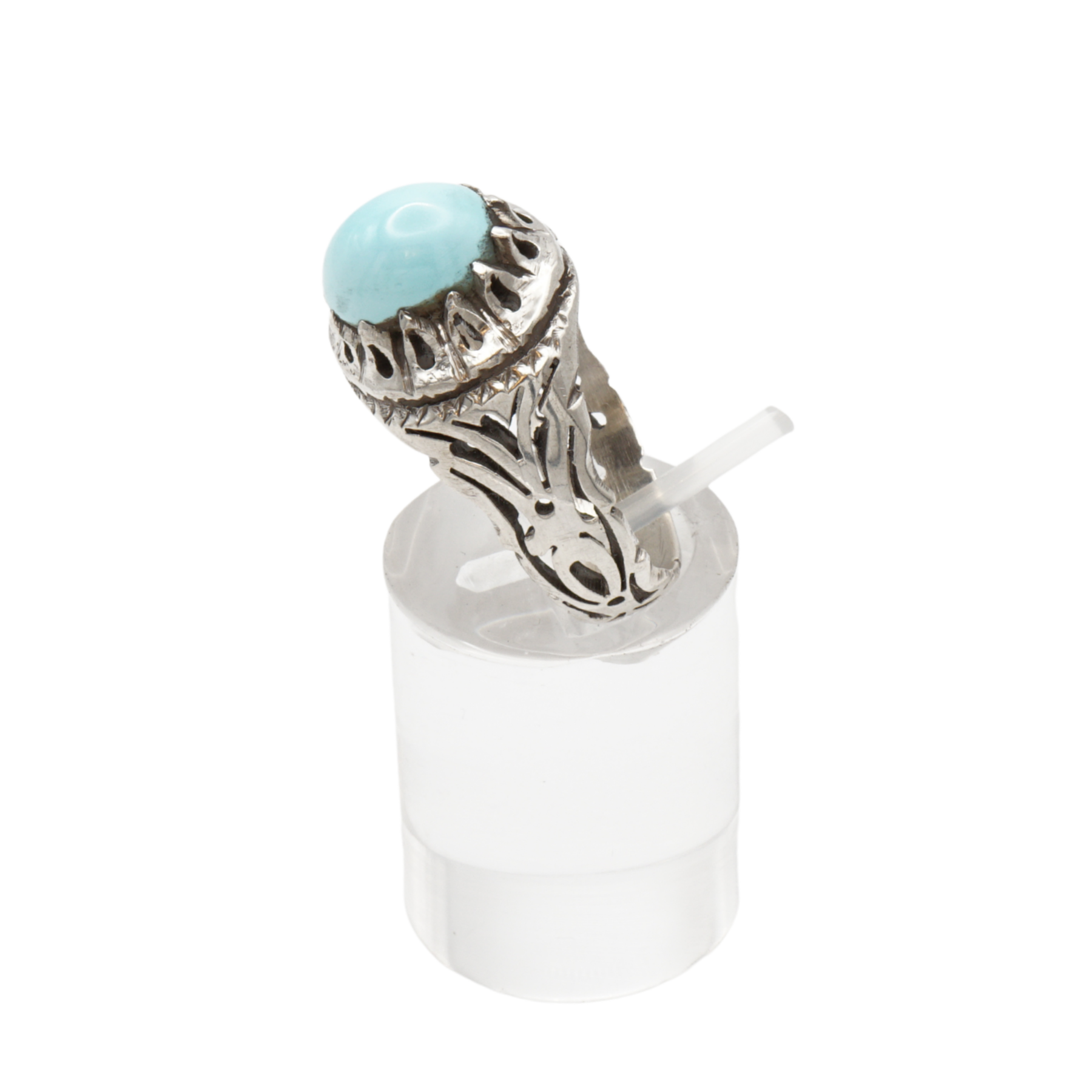 Ein kunstvoll gefertigter Ring aus massivem 925 Sterling Silber, in traditioneller Handarbeit gearbeitet. Im Zentrum steht ein ovaler Türkis aus Nishabur (Iran) – bekannt für seine außergewöhnliche Qualität und intensive Farbgebung. Der Edelstein (ca. 9,5 x 11 mm) besticht durch sein lebendiges Hellblau und wird von einer filigran gearbeiteten Fassung mit Ornament-Details gehalten. Mit ca. 11 g Gewicht ist dieser Ring ein elegantes und dennoch markantes Schmuckstück.